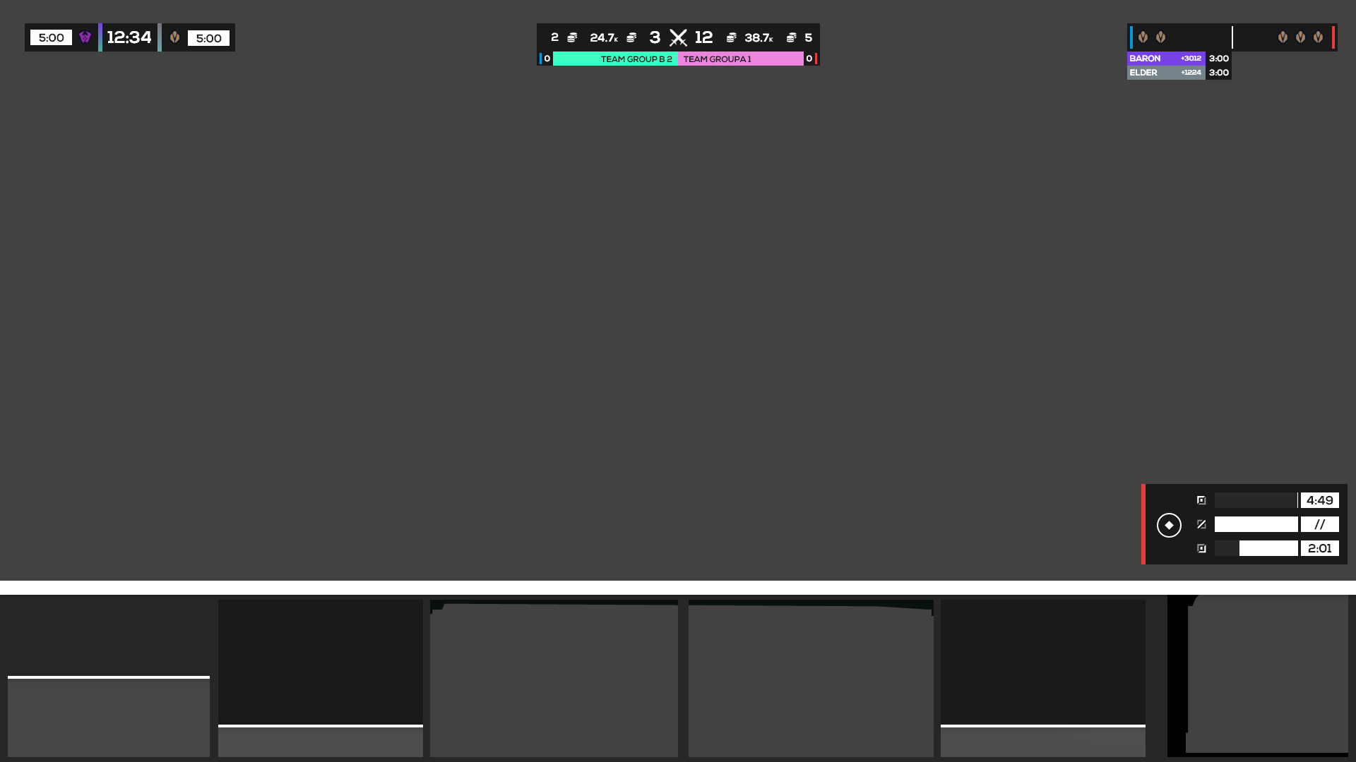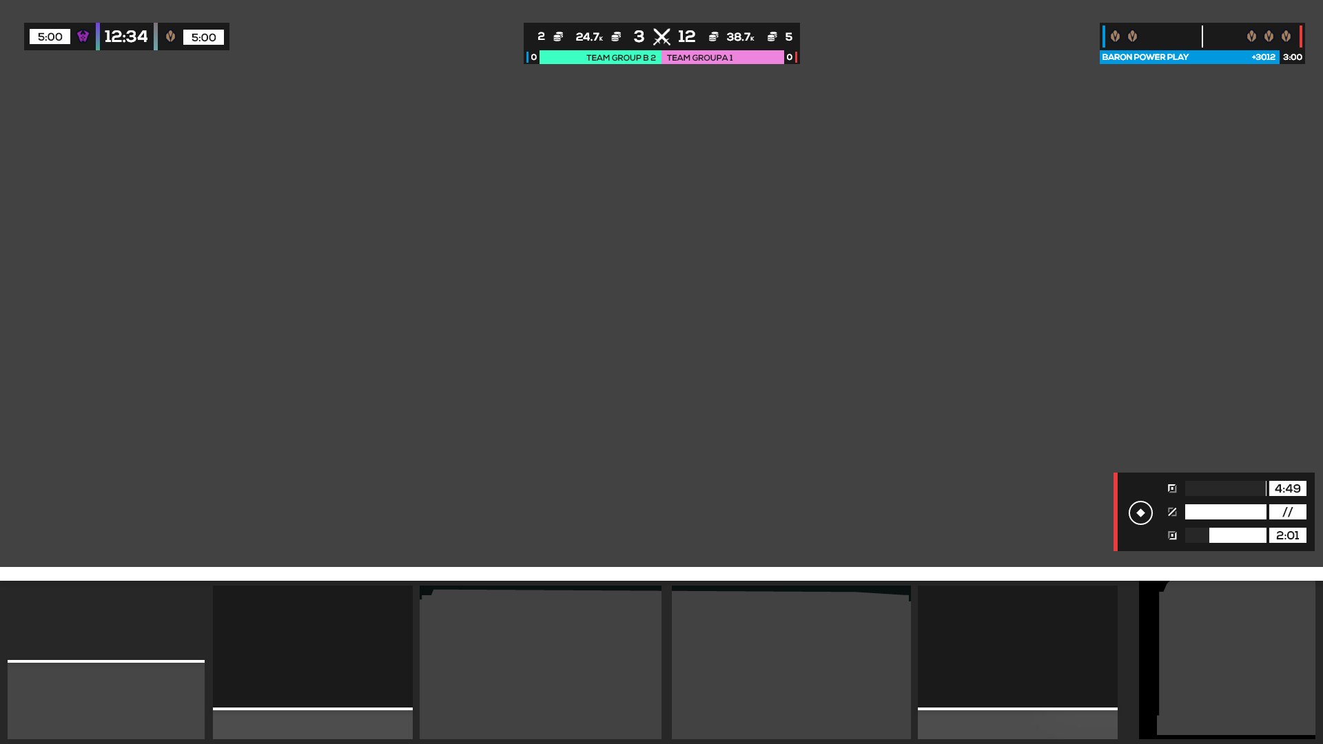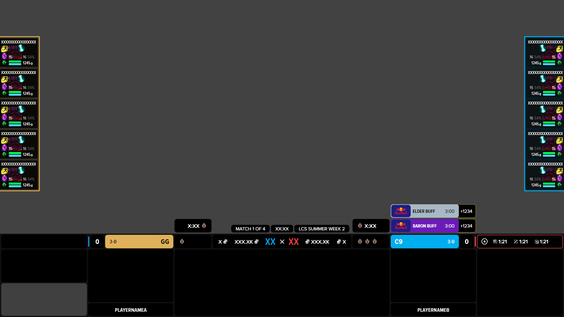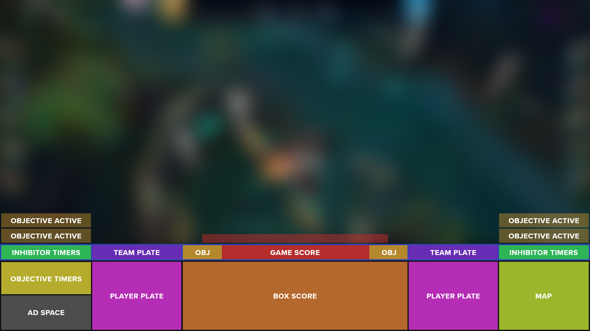 After experimentation, I decided to pursue a singular HUD inside of one that’s split across the screen. This way the viewer only has to move their eyes along a singular linear plane in order to receive all the information they need outside of the actual gameplay. The hierarchy of the HUD, set from the middle to the outer edges, communicates information most relevant to each team and the state of the game and most relevant to the overall game out to the current moment and later game events. Additionally, the HUD can be collapsed to take up just 5% of the total height of the screen or cropped perfectly for vertical form content like TikTok, while still showing the most important and relevant information.