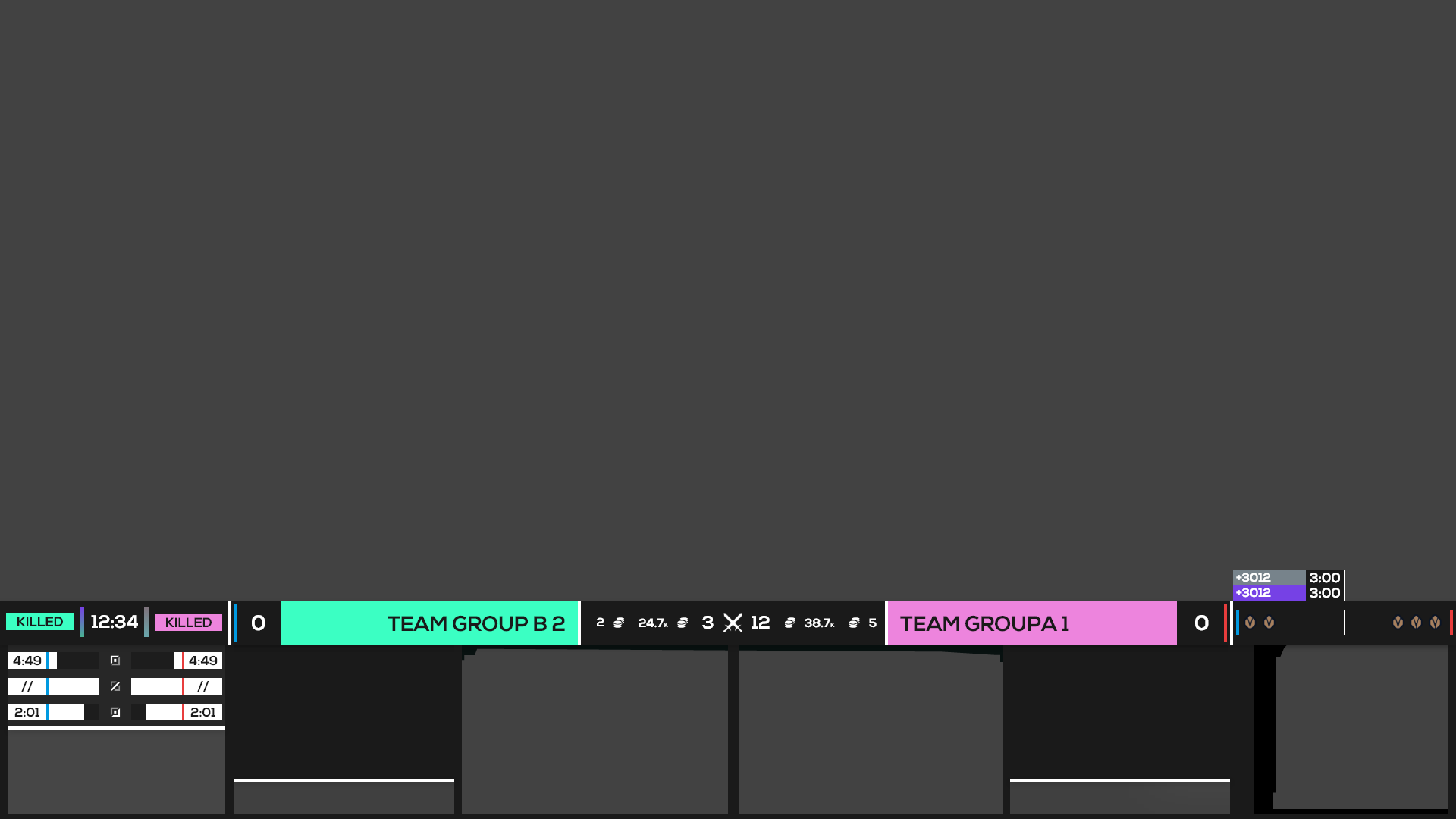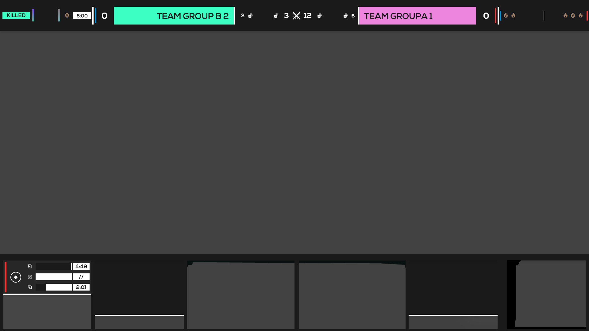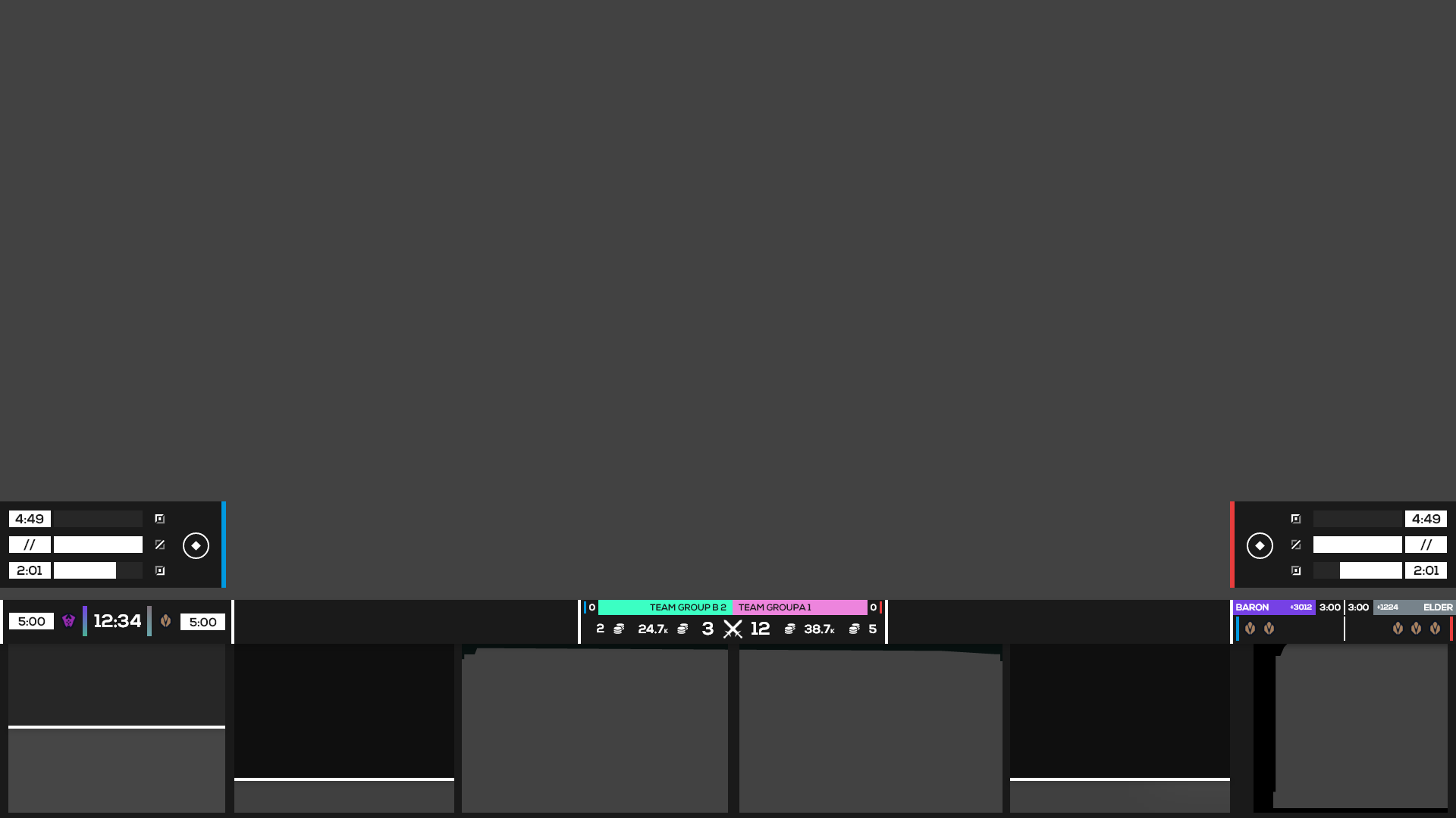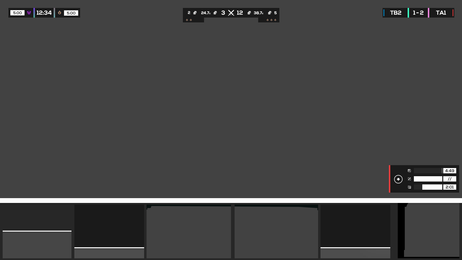 After experimentation, I decided to pursue a singular HUD inside of one that’s split across the screen. This way the viewer only has to move their eyes along a singular linear plane in order to receive all the information they need outside of the actual gameplay. The hierarchy of the HUD, set from the middle to the outer edges, communicates information most relevant to each team and the state of the game and most relevant to the overall game out to the current moment and later game events. Additionally, the HUD can be collapsed to take up just 5% of the total height of the screen or cropped perfectly for vertical form content like TikTok, while still showing the most important and relevant information.
