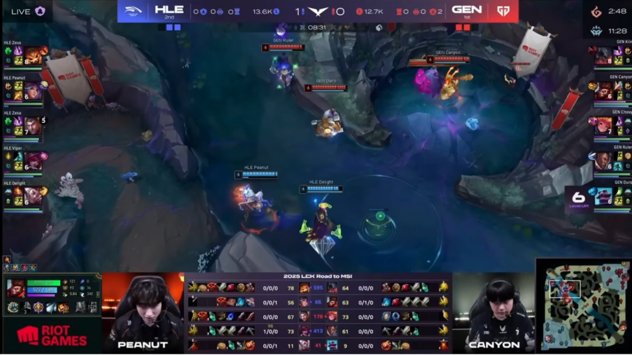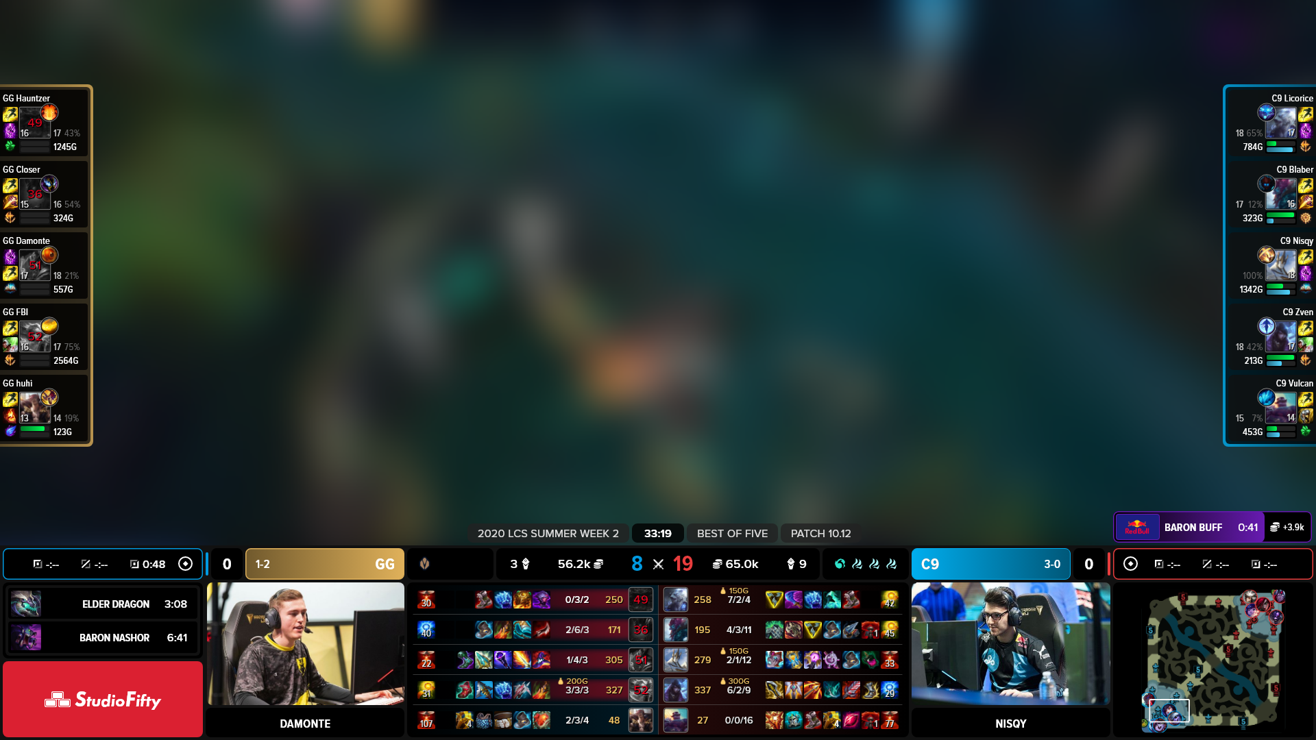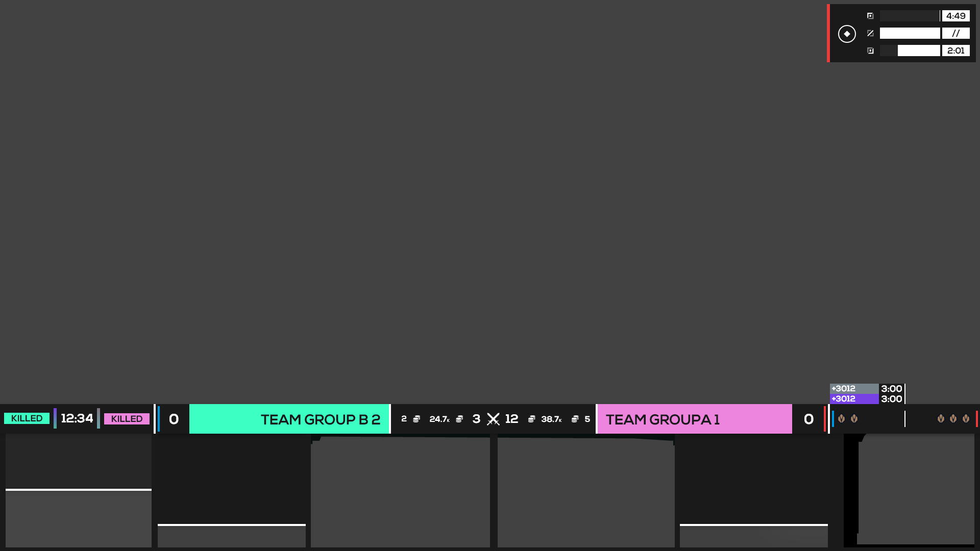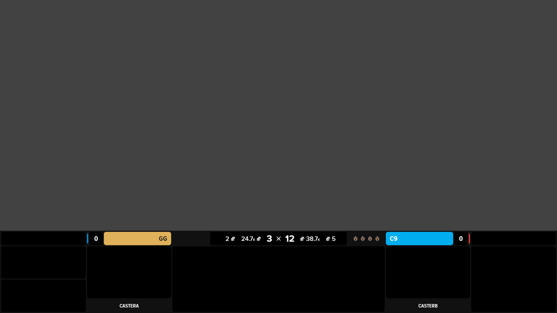 After experimentation, I decided to pursue a singular HUD inside of one that’s split across the screen. This way the viewer only has to move their eyes along a singular linear plane in order to receive all the information they need outside of the actual gameplay. The hierarchy of the HUD, set from the middle to the outer edges, communicates information most relevant to each team and the state of the game and most relevant to the overall game out to the current moment and later game events. Additionally, the HUD can be collapsed to take up just 5% of the total height of the screen or cropped perfectly for vertical form content like TikTok, while still showing the most important and relevant information.